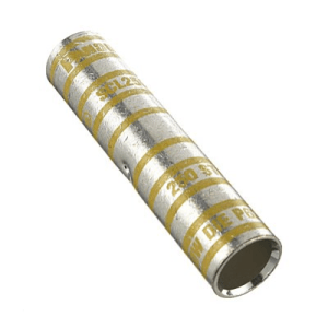 Característica: Heavy duty butt splice connector manufactured from high-conductivity T2 copper with UL and CSA certifications, featuring extended long barrel design specifically engineered for 250 MCM cables with 35kV voltage rating and yellow crimp coding