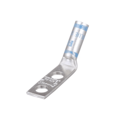 Feature : 45-degree angled design manufactured from high-conductivity T2 copper with full tin plating, featuring dual 1/4″ stud holes with 5/8″ center spacing and blue die insulation