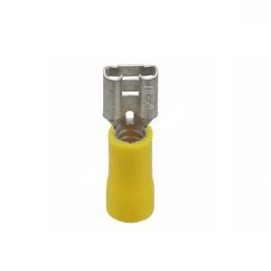 This female spade terminal is crafted with premium T2 copper, delivering superior electrical conductivity and mechanical reliability. Engineered for 12-10 AWG (4-6mm²) wire connections, it features a precision-formed female receptacle design for secure, disconnectable blade terminal mating. The yellow PVC insulation ensures excellent dielectric protection and facilitates easy circuit identification.