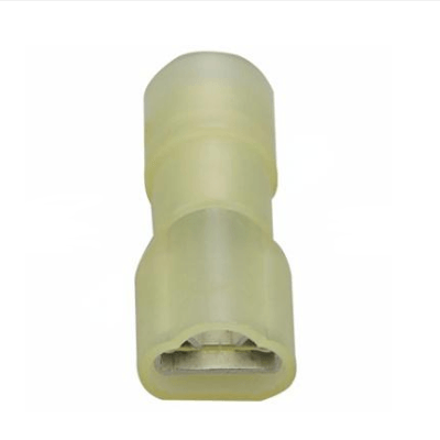 Premium female spade terminal featuring complete nylon insulation that provides full finger protection and prevents accidental short circuits. Designed for 12-10 AWG (4-6mm²) wire connections, this terminal ensures secure mating with male spade connectors while offering excellent electrical insulation and mechanical durability. The bright yellow color ensures quick identification in complex wiring systems.